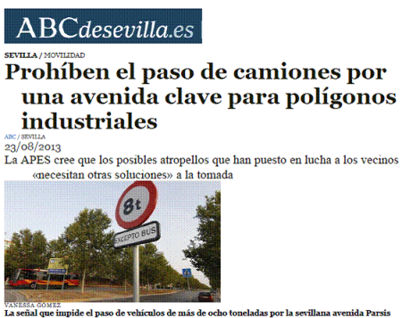 La Asociación de Parques Empresariales de Sevilla (APES) ha alertado de que el Ayuntamiento hispalense, gobernado por Juan Ignacio Zoido (PP), ha colocado una señalización en la Avenida Parsi, que enlaza la A-92 con la A-8028, con la que impide el paso de camiones a partir de ocho toneladas. Recuerda que esta vía es «fundamental» para la actividad empresarial del Parque Empresarial Royal, el Parque Sevilla Industrial (Parsi), y los Polígonos Industriales el Pino y La Negrilla, con unas 700 empresas y un potencial de 25.000 trabajadores. En este sentido, su presidente, Antonio López Balbuena, ha indicado a Europa Press que se trata de un «sinsentido